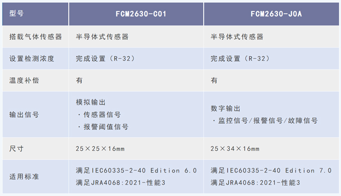 FCM2630模塊的檢測對象以弱可燃制冷劑(R-32)為主,為滿足相關技術規格,我們對其報警濃度值一一進行了最優化設定。標準規格的FCM2630模塊,其報警值都是以檢測R-32而設定的。